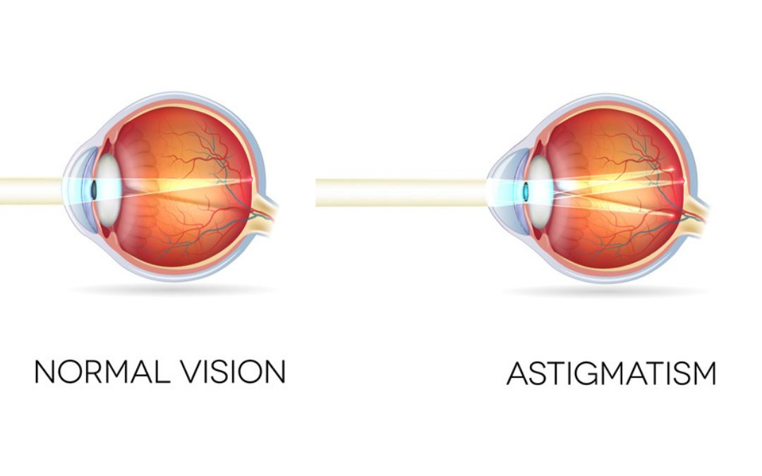 Astigmatism isn’t a disease. It is a highly common condition that impedes the eyes from focusing light in all directions. It develops when two components of the eye, the cornea, and the lens has mismatched curves. In simple words, light comes into the cornea and lens together and bent, and then focused to the back of the eye in the macula. People without astigmatism have a perfectly round cornea, just like a basketball. On the other hand, a cornea with astigmatism is induced by an uncommon curvature and leads to an uncommon shape like a football, which results in two different refractive indices where light comes through and gets focused into two places.
