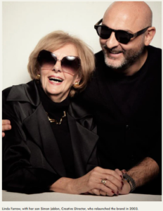 Following a twenty-year hiatus, the brand was revived in 2003 by Linda Farrow’s son, Simon Jablon. At just 24 years old, he rediscovered his mother’s original designs and relaunched the label as Linda Farrow Vintage. The archive collection gained immediate recognition and was soon stocked by leading department stores such as Browns and Harvey Nichols. Strong demand led Simon to fully relaunch the brand, introducing his own designs while remaining true to his mother’s legacy of innovation and boundary-pushing aesthetics.
